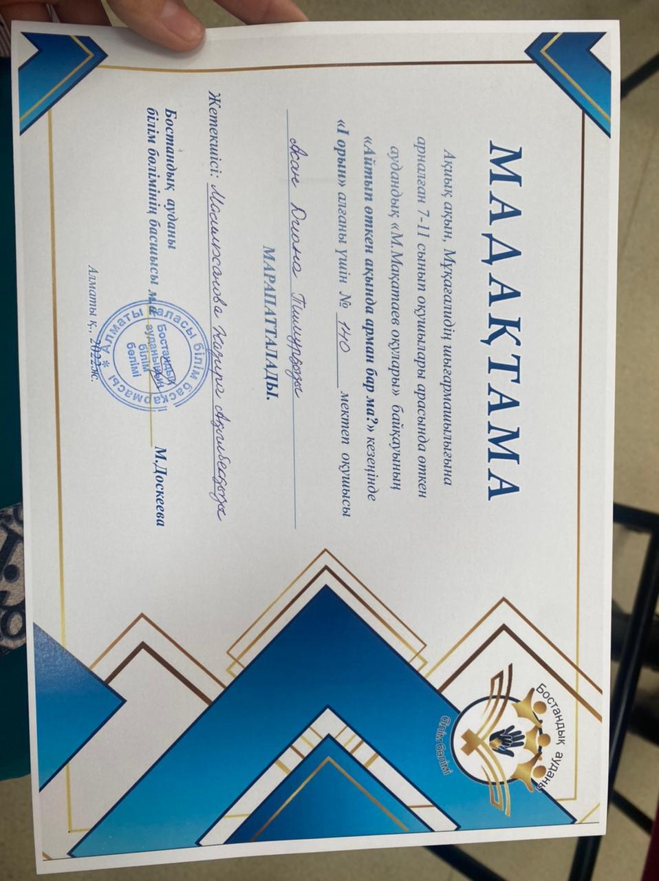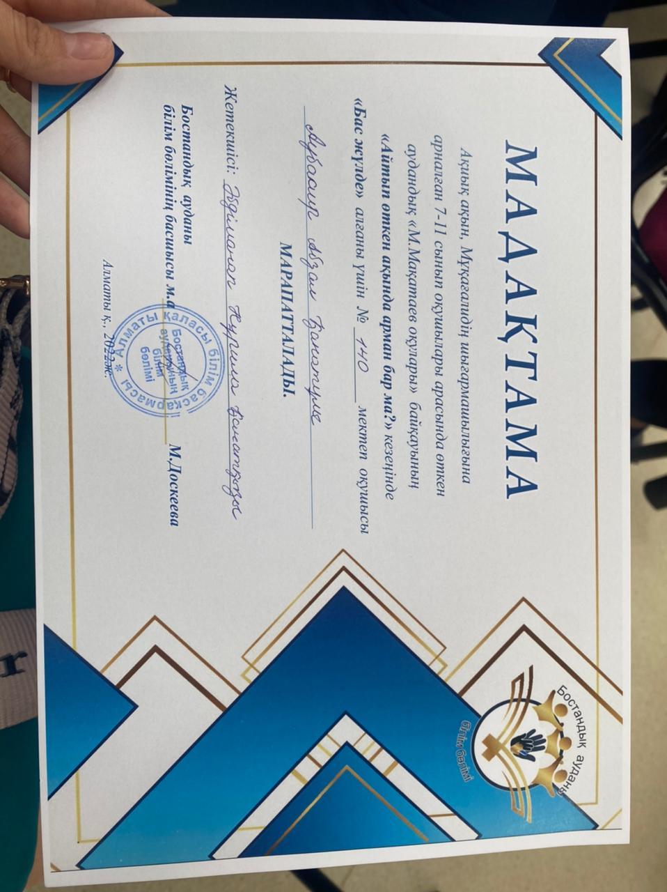 Ақиық ақын Мұқағалидың шығармашылығына арналған 7-11 сынып оқушылары арасында өткен аудандық «М.Мақатаев оқулары» байқауының «Айтып өткен ақында арман бар ма?» кезеңінде 8-сынып оқушылары Қадыржан Алинұр ІІІ дәрежелі дипломмен марапатталса, Аубакир Абзал бас жүлдеге ие болды. Жетекшісі: Әбдіманап Нұрила Қанатқызы. Ақынның отыздан астам өлеңдерін жатқа білетін шәкірттеріміздің шығармашылығы шыңдала берсін. Алар асуларыңыз таусылмасын дегіміз келеді. Ақиық ақын Мұқағалидың шығармашылығына арналған 7-11 сынып оқушылары арасында өткен аудандық «М.Мақатаев оқулары» байқауының «Айтып өткен ақында арман бар ма?» кезеңінде Асан Диана І дәрежелі дипломмен марапатталды. Жетекшісі: Масимханова Жазира Ақылбекқызы. Ақын есімімен аталатын мектептен байқауға қатысып, өлеңдерінен өнеге қалыптастырып жүрген шәкіртімізге шығармашылық шабыт тілейміз.